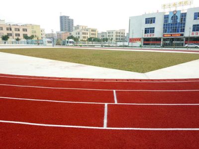 復合型塑膠跑道底層由聚氨酯黏合劑按控制比例混合特殊膠粒后,經由專業施工機械控制厚度鋪設。并在其表面鋪撒特殊膠粒而成。其施工結合了“傳統式”和“透氣式”跑道的工藝,兼具兩者的優點。